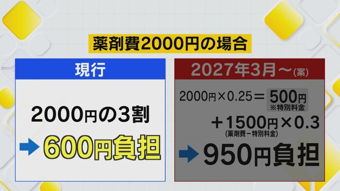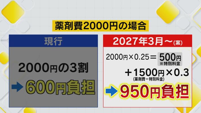 増え続ける医療費の削減が目的で、薬剤費の25%を特別料金として徴収する内容となっている。例えば、薬剤費が2000円の薬の場合、現行の3割負担では600円の負担となる。