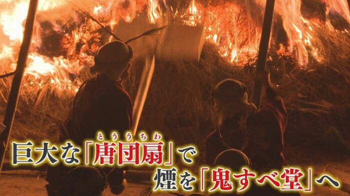 松の葉や藁に火が放たれると、燻手が巨大な唐団扇(とううちわ)で、鬼が立てこもる鬼すべ堂へと煙を送り込む。