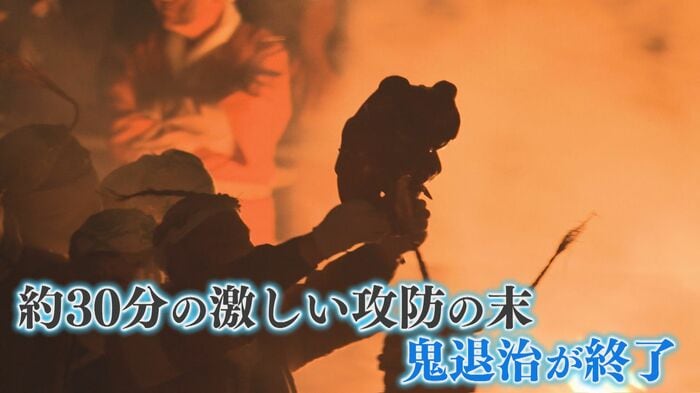 すると鬼警固は、煙を外へ逃がそうと壁を破って抵抗する。約30分に渡る激しい攻防の末、鬼はついに燻し出され『鬼係』に囲まれて退散。2026年も無事、鬼退治が終わった。