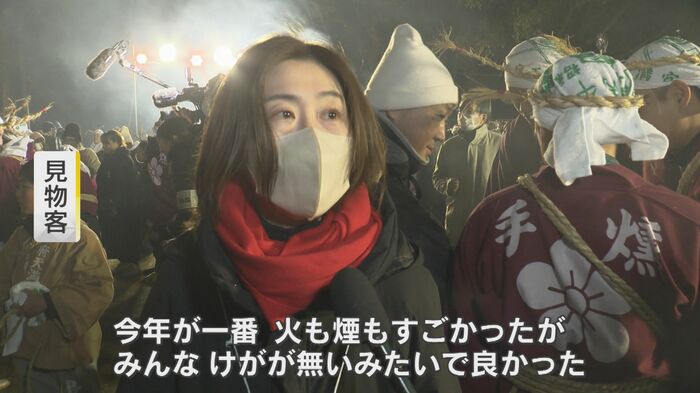 見物客のひとりは「炎が燃え上っていて『本当に全部、焼けるんじゃないか』とちょっとびっくりしました」と興奮した様子で語り、また別の見物客は「(見に来るのは)3年目なんですけど、今年が一番、火もすごくて、煙もすごくて、でもみんなケガがないみたいでよかったです。今年はみんなが明るく楽しく過ごせたら」と1年の無病息災を願っていた。