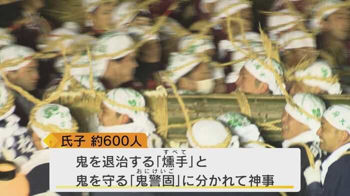 約600人の氏子が、鬼を退治する『燻手(すべて)』と鬼を守る『鬼警固(おにけいご)』に分かれて神事を行う盛大な火祭りだ。