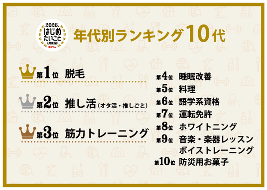 10代は、美容を中心とした“自分磨き”と、推し活に代表される“自己表現”の両方に強い関心を示す世代です。今年は「脱毛」が1位となり、「ホワイトニング」も上位にランクインするなど、外見を整える行動が上位に入りました。また「推し活」が2位に入るなど、好きなアイドルや作品を応援する文化が生活に根付いている点も特徴的です。一方、「語学系資格」や「運転免許」など、将来につながるスキル習得にも意欲を見せており、美容・趣味・未来投資がバランスよく並ぶのが10代ならではの傾向です。