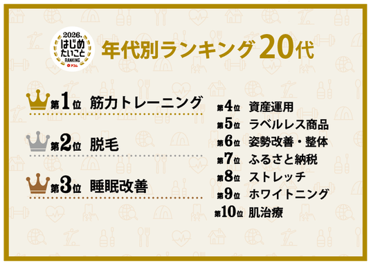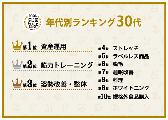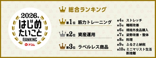アコムは2021年11月より、「誰もがやりたいことに挑戦できる社会を応援する」ために「はじめたいこと、はじめよう!プロジェクト」を始動、その活動のなかで日本全国のみなさんの「はじめたいこと」を毎年調査し、“はじめたいことRANKING”として発表しています。 この調査は「はじめたいこと」を見つけるヒントにしていただくためのもので、全国の10代~60代の2,000名に対して「2026年にはじめたいこと」を調査。総合ランキングは、第1位「筋力トレーニング(筋トレ)」、第2位「資産運用」、第3位「ラベルレス商品」となりました。
