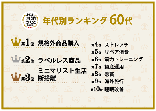 50代は、環境への配慮と健康維持を日々の暮らしに取り入れる“生活密着型の挑戦”が際立ちました。 「ラベルレス商品」や「規格外食品購入」が上位を占め、環境負荷を減らしながら家計にも優しい“サステナブルな選択”が定着していることが伺えます。また、「ストレッチ」「筋力トレーニング」「姿勢改善・整体」「睡眠改善」など、身体のコンディションを整える習慣への関心も高く、健康意識の高さが特徴的です。さらに「懸賞」や「料理」など、日常生活をより楽しく、効率よくする行動もランクイン。身近で続けやすい取り組みを賢く選ぶのが50代らしさとして表れています。