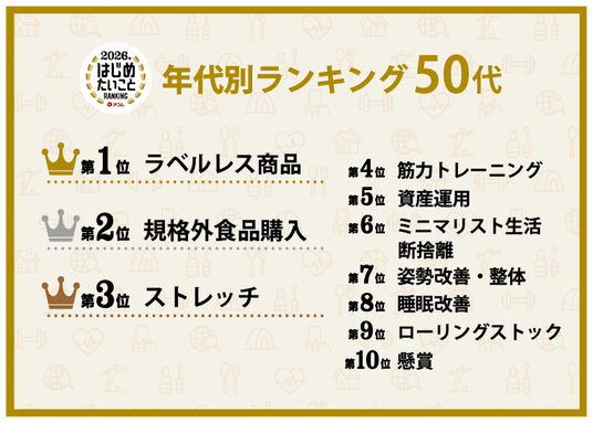 40代は、健康・家計・環境といった生活全体を“賢く整える”意識が最も強い世代です。1位「資産運用」をはじめ、「ストレッチ」「睡眠改善」「姿勢改善・整体」など、年齢とともに高まる体調管理ニーズがランキング上位を占めました。また、「ラベルレス商品」「規格外食品購入」など、環境に配慮しつつ無理なく節約できる行動が評価されているのも特徴です。さらに「週休3日制度」や「ミニマリスト生活」など、働き方や暮らしの負担を減らし、余裕を生み出す選択肢が目立つ結果に。日々の生活を無理なくアップデートしたい40代らしい、堅実で現実的な挑戦が並びました。