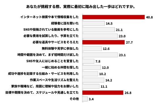 新しい挑戦の第一歩として、最も多かったのは「インターネット検索や本での情報収集」という行動でした。まずは知ることから始める“調べて備える派”が多数派であることがわかります。一方、「必要な道具やサービスをそろえた」、「必要な費用を試算した」など、準備を整えて環境を作る意識も強く見られました。また、「SNSや投稿されている動画を参考にした」「無料体験や見学に参加した」など、実際の雰囲気を確かめながら進めるお試し行動も特徴的。挑戦の始まりは、小さな検索や道具の購入から生まれています。