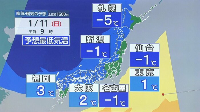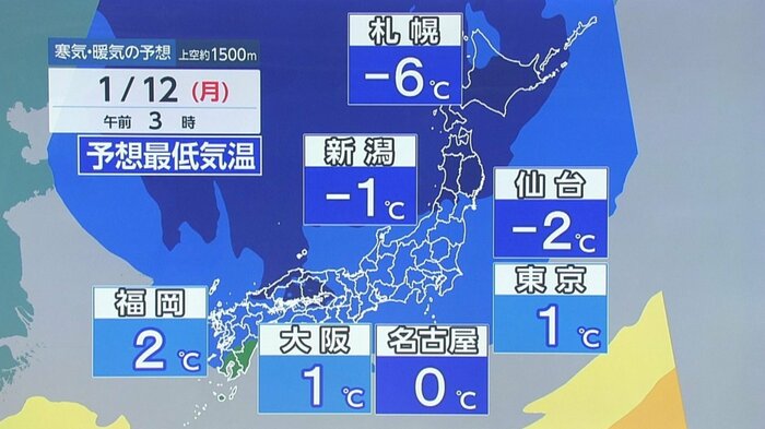 さらに見ていくと、12日月曜日の成人の日はもっと(寒気が)入ってきます。(日本列島に)すっぽりと。「降れば雪」という寒気が伊豆諸島まで入ってきますので、最低気温を重ねてみますとさらに下がるところも出てきます。札幌は最低気温-6℃、新潟は-1℃、これに風が加わりますので体感気温は日曜日から月曜日にかけては間違いなく氷点下になっていきそうです。
