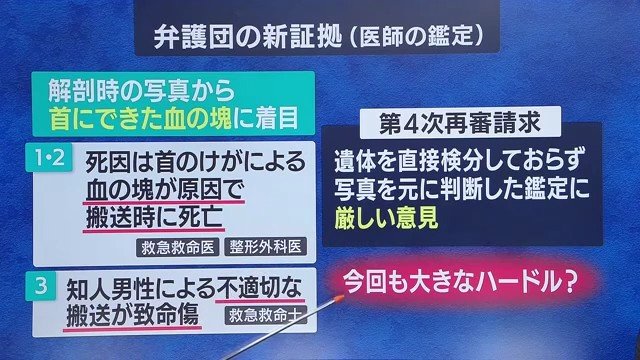 しかし第4次再審請求において、写真をもとにした医師の鑑定結果は「遺体を直接検分したものではなく、限定的な情報から推論を重ねたもので証明力に限界がある」と判断された。今回の新証拠は、この判断をどのように乗り越えるのか。