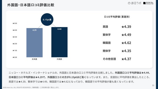 ニッコー・ホテルズ・インターナショナルの、外国語と日本語の口コミ平均評価を比較しました。外国語口コミ平均評価は★4.44、日本語口コミ平均評価は★4.29で、外国語口コミの方が0.15pt高くなっています。また、言語別に平均評価を算出したところ、英語では★4.39、繁体字では★4.49、韓国語では★4.62となっており、韓国語での平均評価が最も高くなっています。