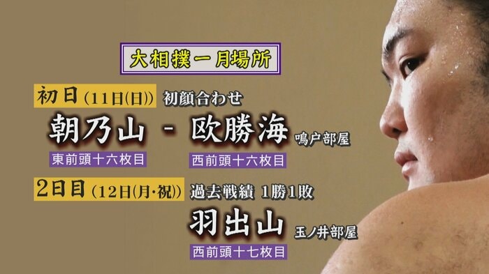 日本相撲協会は9日、初場所2日目までの取組を発表した。東前頭16枚目の朝乃山は初日に石川県出身の鳴戸部屋・欧勝海と対戦する。2日目は新入幕の玉ノ井部屋・羽出山との対戦が決まっており、羽出山とはこれまでの対戦成績が1勝1敗となっている。