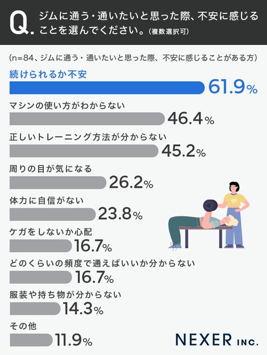 「マシンの使い方がわからない」が46.4%、「正しいトレーニング方法が分からない」が45.2%と続いています。また「周りの目が気になる」が26.2%、「体力に自信がない」が23.8%という結果になりました。