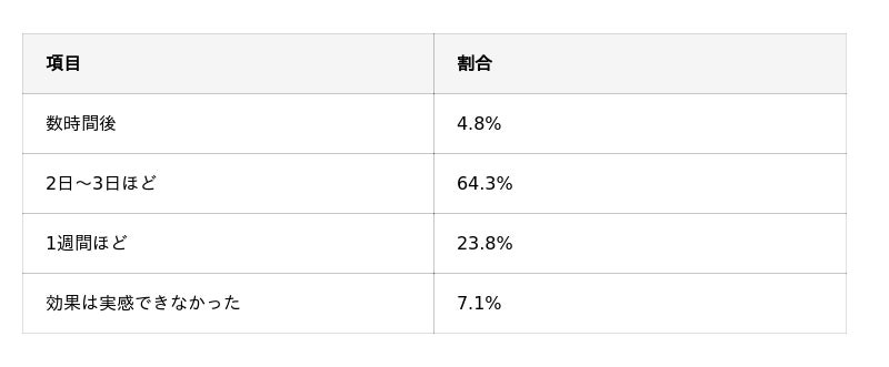 施術後、効果を「2日~3日ほど」で感じ始めたと回答した人が64.3%と最も多く、比較的早い段階で変化を実感している方が多い結果となりました。