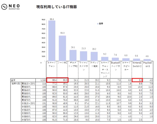 一方で「Nintendo Switch 2」は5.5%→8.0%とやや上昇。スマホやPCの“汎用デバイス”は抑えつつも、娯楽は“専用機で楽しみたい”意向がうかがえます。