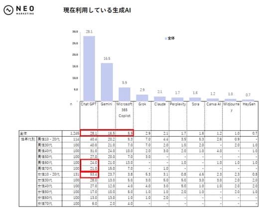 全体では「Chat GPT」が28.1%→29.2%、「Gemini」が16.5%→17.7%、「Microsoft 365 Copilot」が5.9%→7.9%と“主力どころの微増”が目立つ結果に。