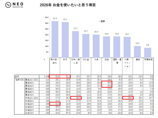全体では「食料品・飲料」(31.9%)と旅行(31.1%)が2トップに。生活必需と“体験”への支出意欲が同居しています。さらに「預貯金」(20.7%)や「投資」(18.6%)も一定割合を占め、“使う”と同時に“備える”姿勢が強い点が特徴です。