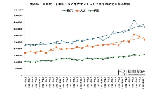 以下のグラフでは、東京駅から30~40分圏に位置する横浜駅(神奈川県)、大宮駅(埼玉県)、千葉駅(千葉県)について、中古マンションの予想平均成約坪単価の時系列推移を示しています。