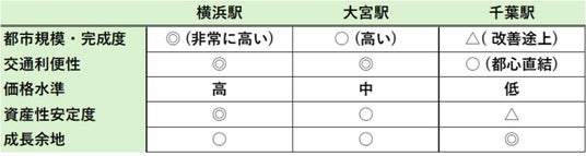 これらを一覧表で整理すると、横浜駅が総合力で非常に強いエリアに見えます。ただし、東京駅からの所要時間が同等という前提に立つと、大宮駅や千葉駅は価格水準が低いにもかかわらず、資産性が極端に劣るわけではありません。特に成長性や需給の安定性を考慮すれば、「相対的に割安」と評価することも可能です。