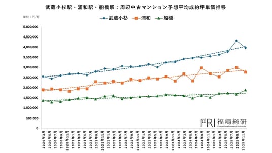 こちらのグラフでも、価格水準および上昇トレンドは「武蔵小杉 → 浦和 → 船橋」の順となっており、都心近接性とエリアブランド力の差が明確に価格に反映されています。