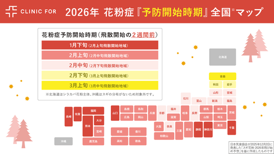 全国10院以上*2の対面診療とオンライン診療を展開する「クリニックフォアグループ」(以下クリニックフォア)は、2026年春のスギ花粉飛散について、最新予測にもとづく傾向と、シーズンをより快適に過ごすための準備・受診のポイントを発表しました。