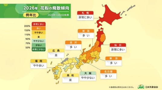 2026年春の花粉症は、東日本および北日本で例年より多く、北海道では例年の2倍以上に増加する見込みです。飛散開始時期は例年並みで、2月上旬から本格的な花粉シーズンに突入すると予測されています。(※一般財団法人 日本気象協会 2025年12月2日発表)