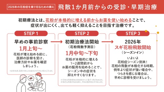 構え1.:飛散開始1か月前からの受診・早期治療でピーク時の症状を緩和ポイント:花粉が本格的に飛ぶ前からお薬を飲み始めると症状のピークを抑えやすい
