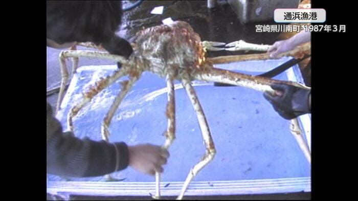 今から約40年前の1987年、宮崎県川南町の通浜(とおりはま)漁港に、脚を広げると3メートルにもなる巨大なカニが水揚げされた。世界最大のカニと言われる「タカアシガニ」で、川南町沖の日向灘で釣り上げられたもの。大物の出現に、港は驚きと活気に包まれた。テレビ宮崎のアーカイブ映像で、当時の様子をお伝えする。