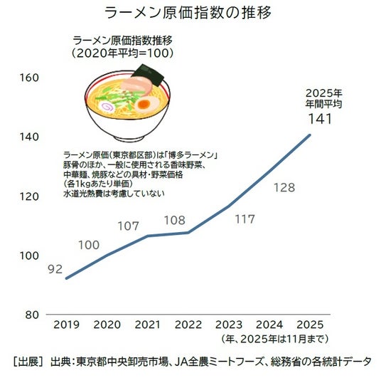 ラーメン店では、小麦や野菜、油脂類など原材料価格の高止まりが続き、コスト面でも厳しい経営環境は変わらない。ラーメンで使用する原材料のトータルコスト推移を示す「ラーメン原価指数(豚骨ベース、東京都区部)」をみると、2020年平均を100とした場合における2025年の原価指数は141となった。