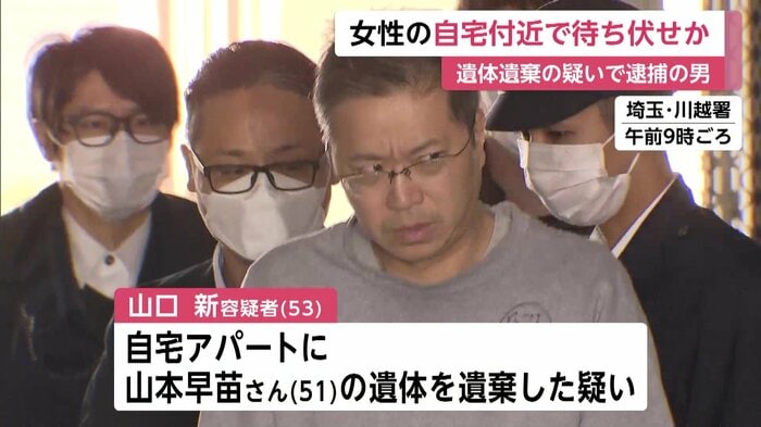 山口新容疑者(53)は、新座市の自宅アパートに川越市に住む山本早苗さん(51)の遺体を遺棄した疑いで10日朝、送検された。