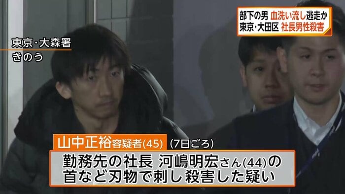 山中正裕容疑者(45)は7日ごろ大田区のマンションで、勤務する会社の社長・河嶋明宏さんの首などを刃物で刺して殺害した疑いが持たれています。