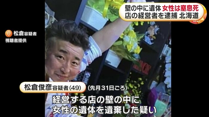 北海道・日高町の飲食店経営・松倉俊彦容疑者(49)は、2025年12月31日ごろ、自身が経営する店の壁の中に女性の遺体を遺棄した疑いが持たれている。