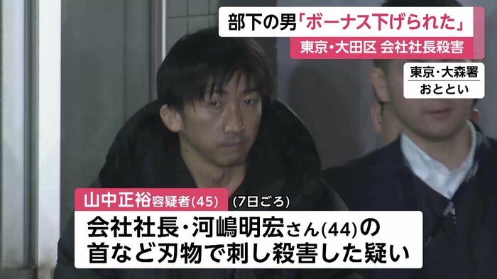 東京・大田区で会社社長の男性が殺害された事件で、逮捕された部下の男が「ボーナスを下げられた」などと供述していることが分かりました。