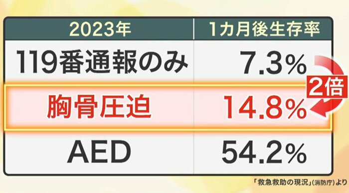 119番通報以外に処置がなかった場合の1カ月後生存率が約7%なのに対し、胸骨圧迫を行えば約15%、さらにAEDを使用すれば50%を超える。