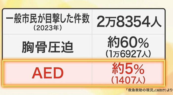 しかし、現実には課題が山積している。胸骨圧迫が行われる割合は約6割にのぼるが、AEDの使用率はわずか5%にとどまっているのが実情だ。