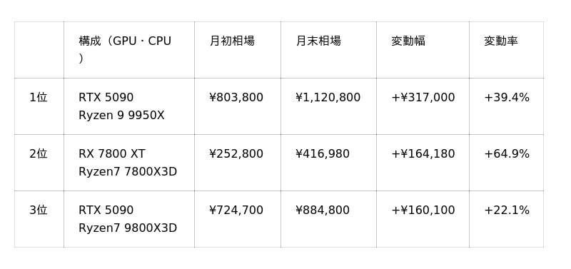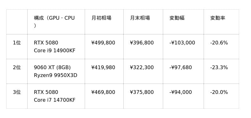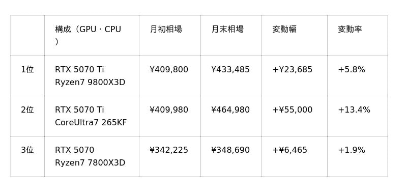 ・人気構成の RTX 5070 Ti + Ryzen7 9800X3D は約2.4万円値上げ(+5.8%)