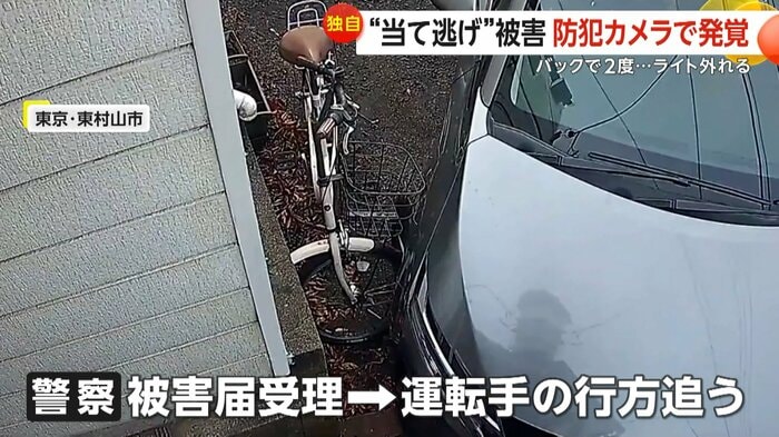 東京・東村山市で2025年12月、自宅敷地内に止めてあった自転車が、バックしてきた乗用車に何度も接触される当て逃げ被害があり、防犯カメラに一部始終が記録されていた。被害者は愛用10年の自転車を壊され、無言で立ち去った運転手の対応に「せめてなにか一言あれば…」と話している。