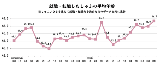 転職しゅふの平均年齢は46.7歳となり、前月比で+0.7歳、前年同月比で+1.9歳と上昇しました。前年差でほぼ2歳以上の伸びとなっており、同条件で比較可能な2016年7月以降で過去最高を記録しました。