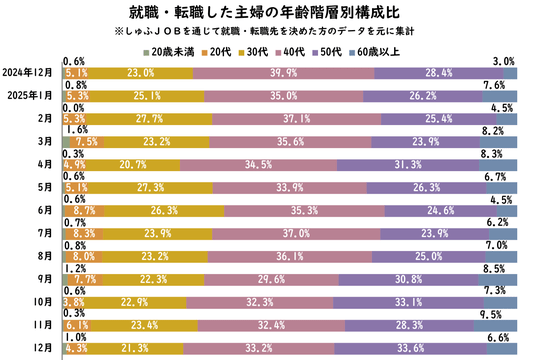 12月に平均年齢が上昇する傾向は、例年確認されています。年末は学校が冬休みに入ったり、帰省などが重なる時期であることから、しゅふ層、特に子育て世代にとって就職・転職活動に時間を割きにくい状況になりやすいと考えられます。