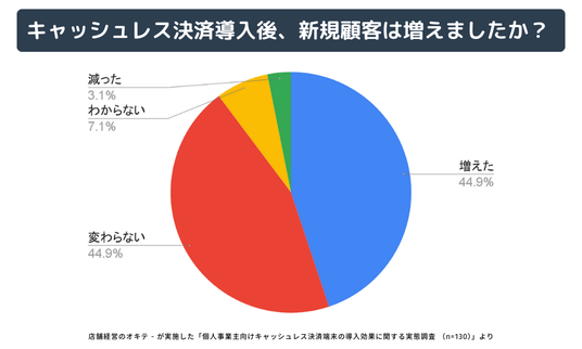 キャッシュレス決済導入後に新規顧客が「増えた」と回答した事業主は43.8%(57名)に上りました。「変わらない」も43.8%(57名)で、「減った」はわずか3.1%(4名)でした。