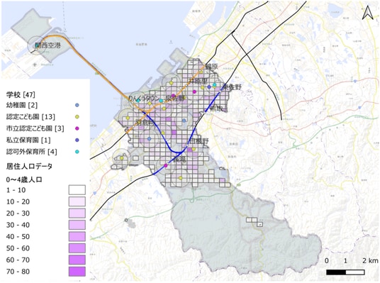 未就学児施設や小中学校の配置から子育て環境を考察。子どもの多いエリアと教育施設の充足状況を重ね合わせ分析しました。