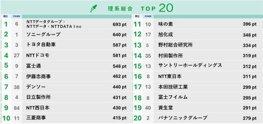 2. 理系総合:NTTデータグループが1位に。IT・通信・自動車部品が上位を独占。