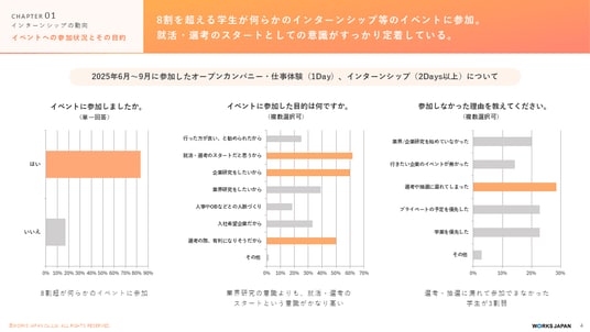 2025年9月、ワークス・ジャパンが行った27卒学生を対象とした調査では、夏休みの段階で8割を超える学生がインターンシップ等のイベントに参加していると回答しました。