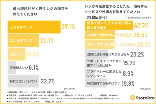 「最も理想的だと思うレジの種類」について尋ねたところ、『セミセルフレジ(商品登録はスタッフ、支払いのみセルフ)(37.1%)』が最も多く、『フルセルフレジ(商品登録から支払いまで全てセルフ)(22.1%)』『有人レジ(スタッフが会計対応)(12.5%)』と続きました。