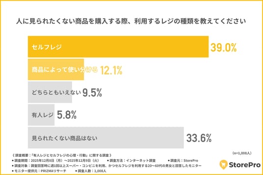 「人に見られたくない商品を購入する際に選ぶレジの種類」について尋ねたところ、『セルフレジ(39.0%)』と回答した方が最も多く、『商品によって使い分ける(12.1%)』と続きました。