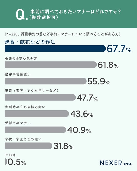 事前に確認したいマナーとして最も多かったのは「焼香・献花などの作法」で、さらに「香典の金額や包み方」「挨拶や言葉遣い」が続きました。