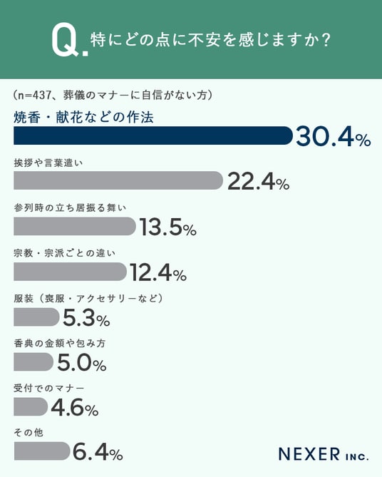 不安点としてもっとも多かったのは「焼香・献花などの作法」で3割を超えました。