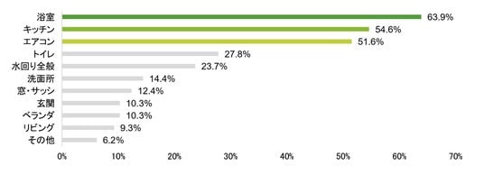 ● お金をかけてでも頼んでよかった掃除箇所 TOP3は「浴室(63.9%)」、次いで「キッチン(54.6%)」、「エアコン(51.6%)」という結果に