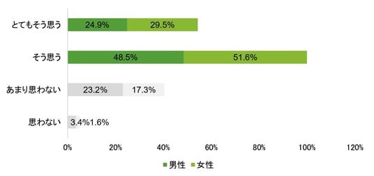 家事負担について伺いました。結果、男性の73.4%、女性の81.1%が「とてもそう思う」「そう思う」と回答し、男女ともに家事負担が減ればもっと休めると考えていることが明らかになりました。