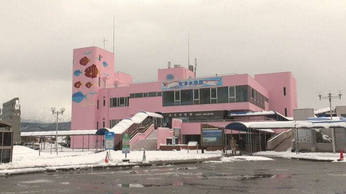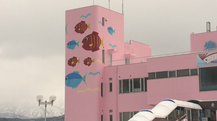 富山県魚津市の魚津水族館が鮮やかなピンク色の外壁で注目を集めている。雪景色に映える明るい色は、SNSでも「竜宮城のような魚津水族館」と話題になっている。