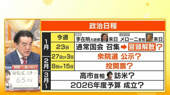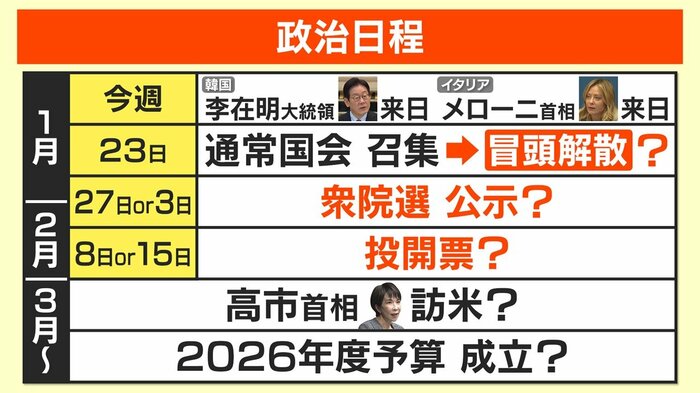 ただこれから先、国会が始まって予算委員会が始まると、また別の要素が出てくるかも知れない。新しい政治とカネの問題、旧統一教会と自民党の関係が報道され、それも追及を受けるかも知れない。あとは連立を組んでいる維新で「国保逃れ」みたいなことが起きているのもあって、そういうマイナス要素を換算すると、そういった審議に入るより、例えば今週は外交ウィークと言われていますが、日韓首脳会談やイタリアのメローニ首相との会談、こういったプラス材料で発信をして、いい材料のまま選挙に突っ込んだ方がいいと、そういう判断が強まってきたと。