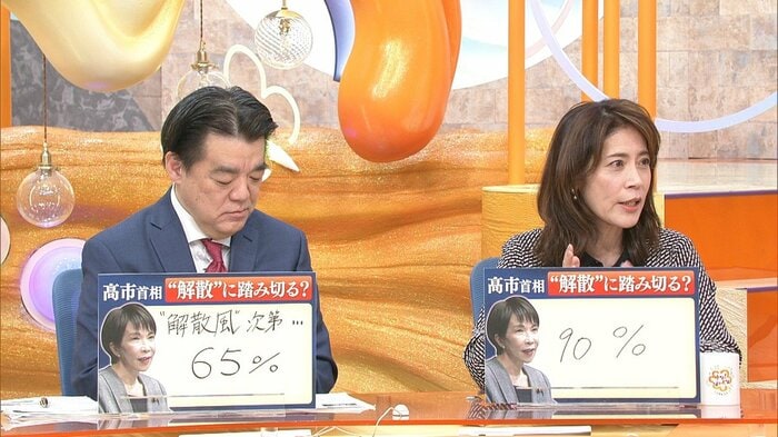 果たして高市首相は解散に踏み切るのか?その可能性として、岩田氏は「90%」、松山氏は「65%」と回答しました。
